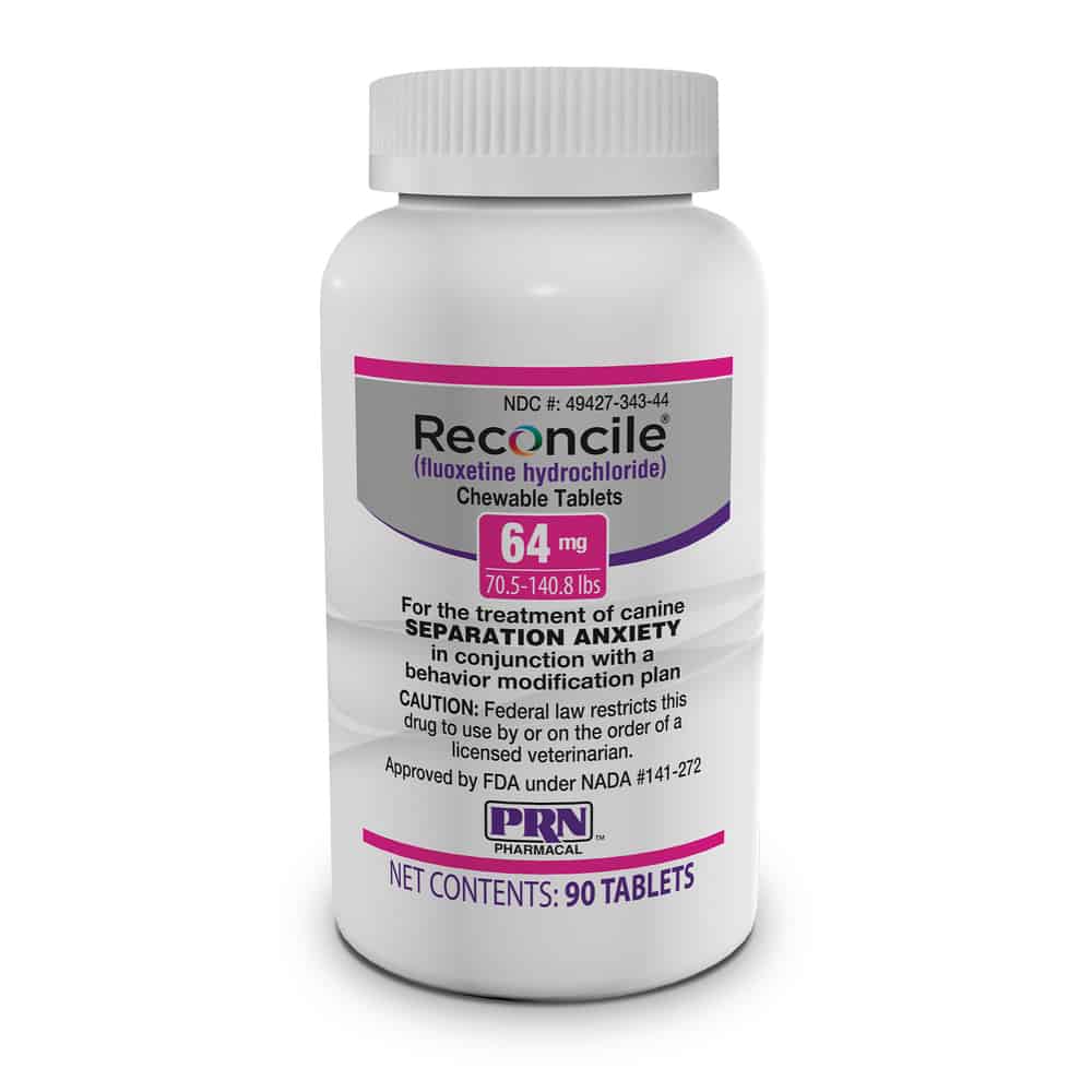 This is a chewable tablet used alongside a behavior modification plan to treat separation anxiety in dogs. It works by increasing serotonin levels in the brain to help your dog stay calm when left alone. It requires a prescription from your veterinarian, and is available in 8 mg, 32 mg, and 64 mg strengths. Reconcile does not act as a sedative.