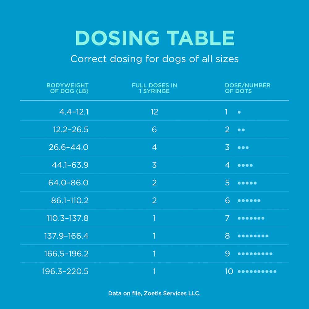 The amount of Sileo to be administered is based on your dog's weight. Each dose corresponds to the number of dots on the syringe (each dot (•) represents 0.25 ml of Sileo): dogs 4.4-12.1 lbs give 0.24 ml (1 •), dogs 12.2-26.5 lbs give 0.5 ml (2 •), dogs 26.6-44.0 lbs give 0.75 ml (3 •), dogs 44.1-63.9 lbs give 1.0 ml (4 •), dogs 64.0-86.0 lbs give 1.25 ml (5 •), dogs 86.1-110.2 lbs give 1.5 ml (6 •), dogs 110.3-137.8 lbs give 1.75 ml (7 •), dogs 137.9-166.4 lbs give 2 ml (8 •), dogs 166.5-196.2 lbs give 2.25 ml (9 •), dogs 196.3-220.5 lbs give 2.5 ml (10 •). For dogs weighing over 86.0 lbs, divide the dose between both sides of the mouth.