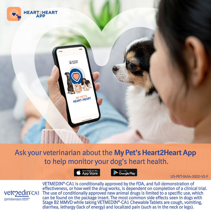 Vetmedin®-CA1 (pimobendan) chewable tablets is conditionally approved for the treatment of dogs with myxomatous mitral valve disease (MMVD) in the pre-clinical stage B2 (asymptomatic with a murmur/abnormal heart sounds and evidence of increased heart size) to delay onset of clinical signs of heart failure. Conditionally approved by FDA pending a full demonstration of effectiveness under application number 141-556 (please see full prescribing information). Given every 12 hours, the unique dual action of VETMEDIN®-CA1 dilates the blood vessels carrying blood to and from the heart—reducing the overall load on the heart—while simultaneously improving the ability of the heart muscle to contract. The active ingredient in VETMEDIN®-CA1 (pimobendan) helps the heart muscle to contract and relax (pump) more effectively and it dilates blood vessels which reduces the amount of force with which the heart needs to pump blood.