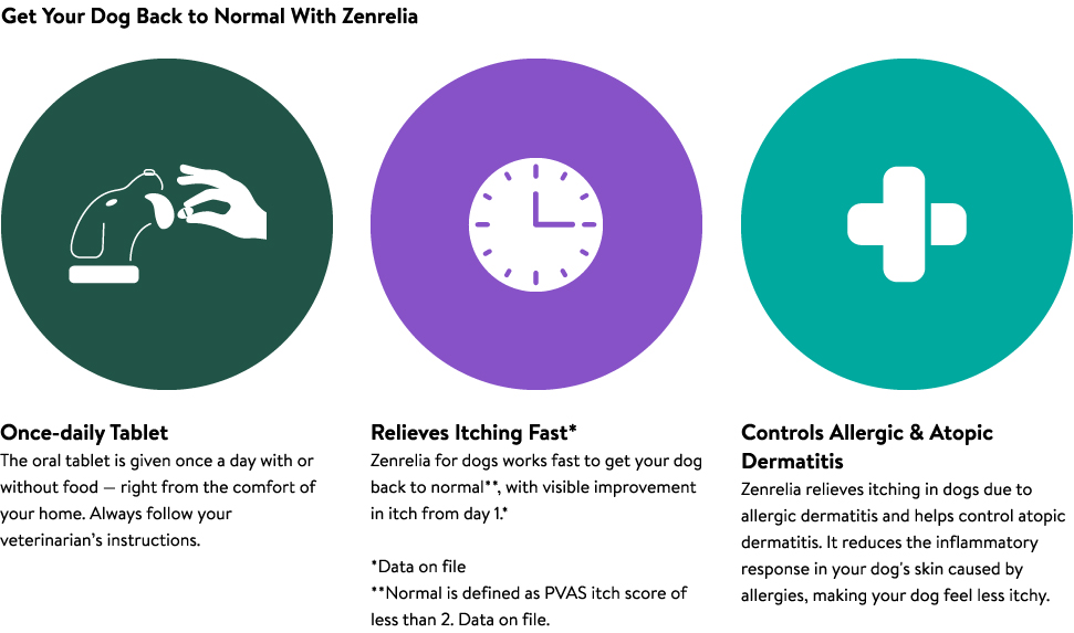 Zenrelia is an innovative, once-daily treatment that offers relief from itchy, irritated skin - right from the start. Allergic dermatitis can make your dog very uncomfortable. Symptoms like excessive itching, scratching, and biting aren't only disruptive to you and your pet, but they can also cause more severe problems over time, including hair loss and skin infection. Don’t let allergic itch disrupt your dog’s Zen. Reach for Zenrelia.