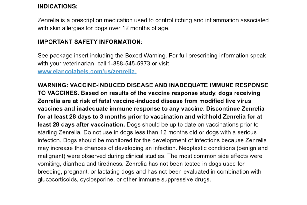 The Zenrelia label contains a boxed safety warning regarding the risk of fatal vaccine-induced disease from modified live virus vaccines and inadequate immune response to vaccines, with instructions to discontinue Zenrelia for at least 28 days to 3 months prior to vaccination and at least 28 days after vaccination. This boxed safety warning is specifically due to the results of a vaccine response study in which 8 young, unvaccinated dogs were treated with 3 times the label dose and were sick at the time of vaccination*. Future studies should evaluate the response to vaccination in healthy dogs. *Elanco Animal Health. Data on File.