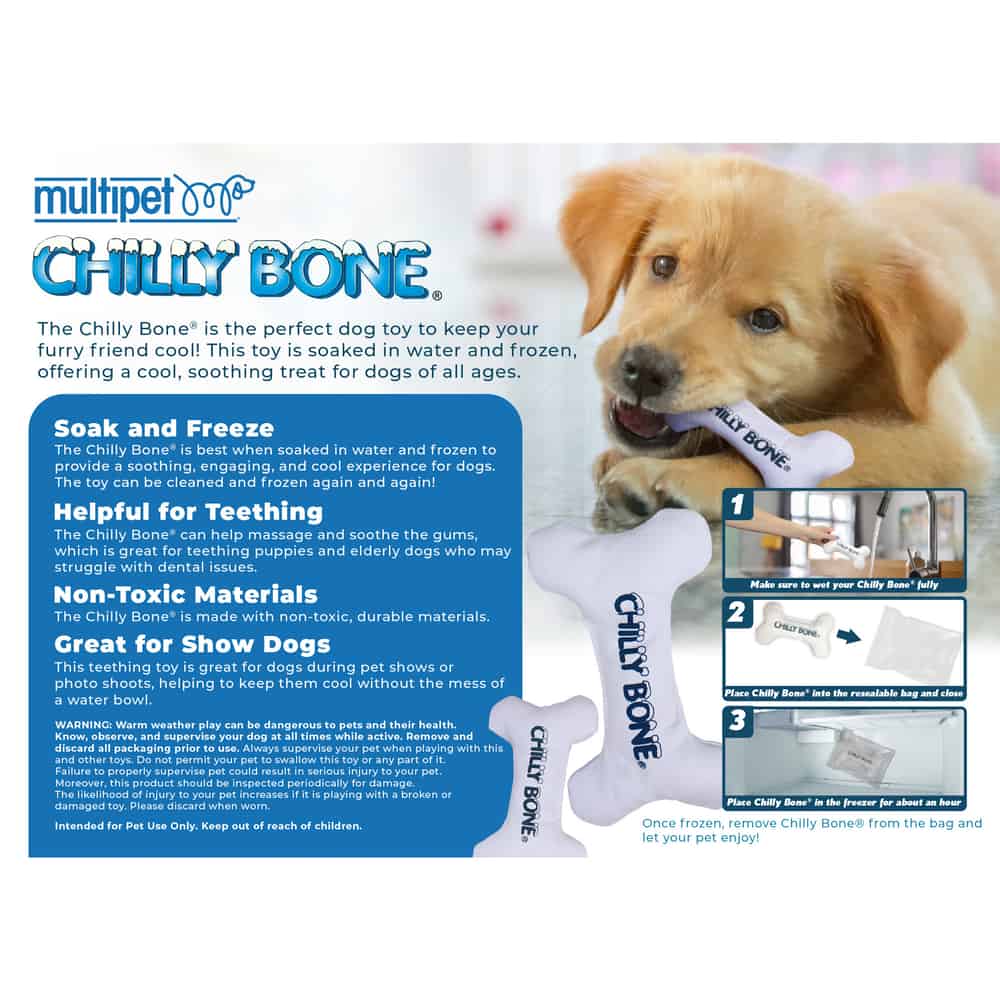 The Chilly Bone is the perfect dog toy to keep your furry friend cool! This toy is soaked in water and frozen, offering a cool, soothing treat for dogs of all ages. Its cold properties are perfect for soothing the irritated gums of teething puppies or elderly dogs. The Chilly Bone gently massages the gums while chewing, helping to clean and stimulate for improved oral health. Made from non-toxic durable materials, it’s safe for your pet to chew on for hours. Great for warmer weather, this dog toy provides a refreshing way to keep dogs cool and engaged. No dog can resist the Chilly Bone!