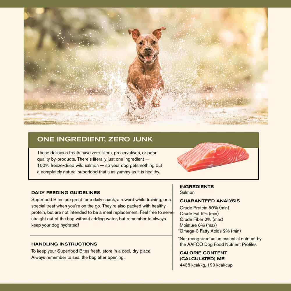 - Just one ingredient, 100% freeze-dried Wild Salmon, so your dog gets nothing but a completely natural superfood that’s as yummy as it is healthy