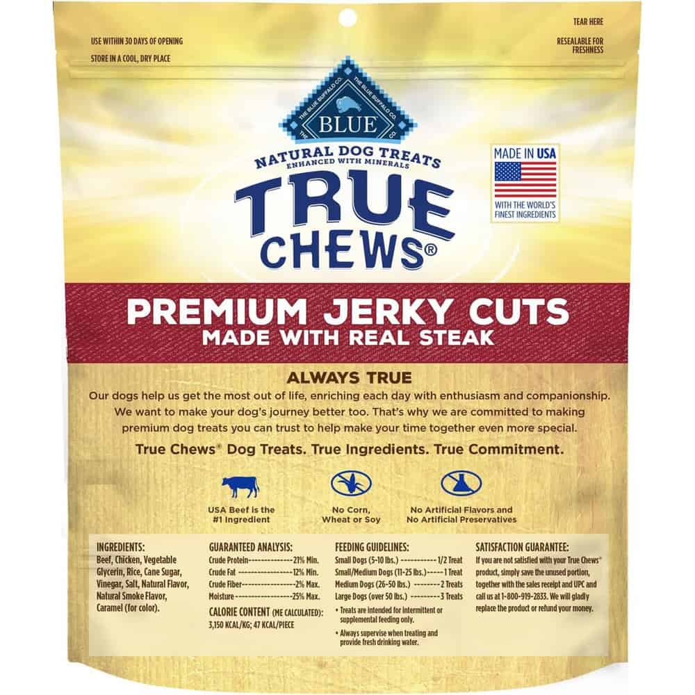 Give your furbaby the taste of real beef with Blue Buffalo True Chews Premium Jerky Cuts Dog Treats. Made with real USA beef as the first ingredient, these tender dog treats are easy to tear into smaller pieces, so they’re great for dogs of all breed sizes and ages. And like all Blue Buffalo dog treats, these treats for dogs never contain chicken (or poultry) by-product meals, corn, wheat, soy, artificial flavors, or preservatives. Watch your best friend’s tail wag when you reward him with Blue True Chews Dog Treats.