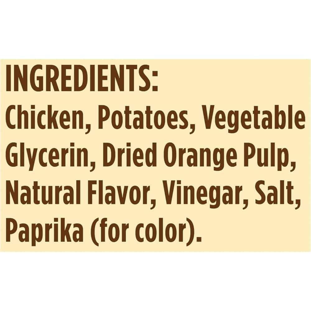 | Chicken, Potatoes, Vegetable Glycerin, Dried Orange Pulp, Natural Flavor, Vinegar, Salt, Paprika (for color) |