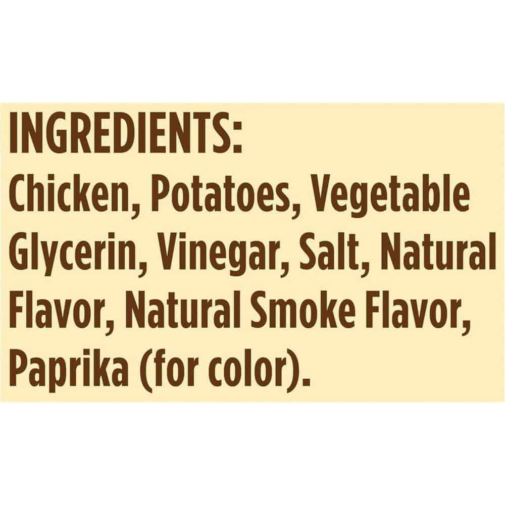 | Chicken, Vegetable Glycerin, Natural Flavors, Distilled Vinegar, Salt, Natural Smoke Flavor, Colored with Paprika |