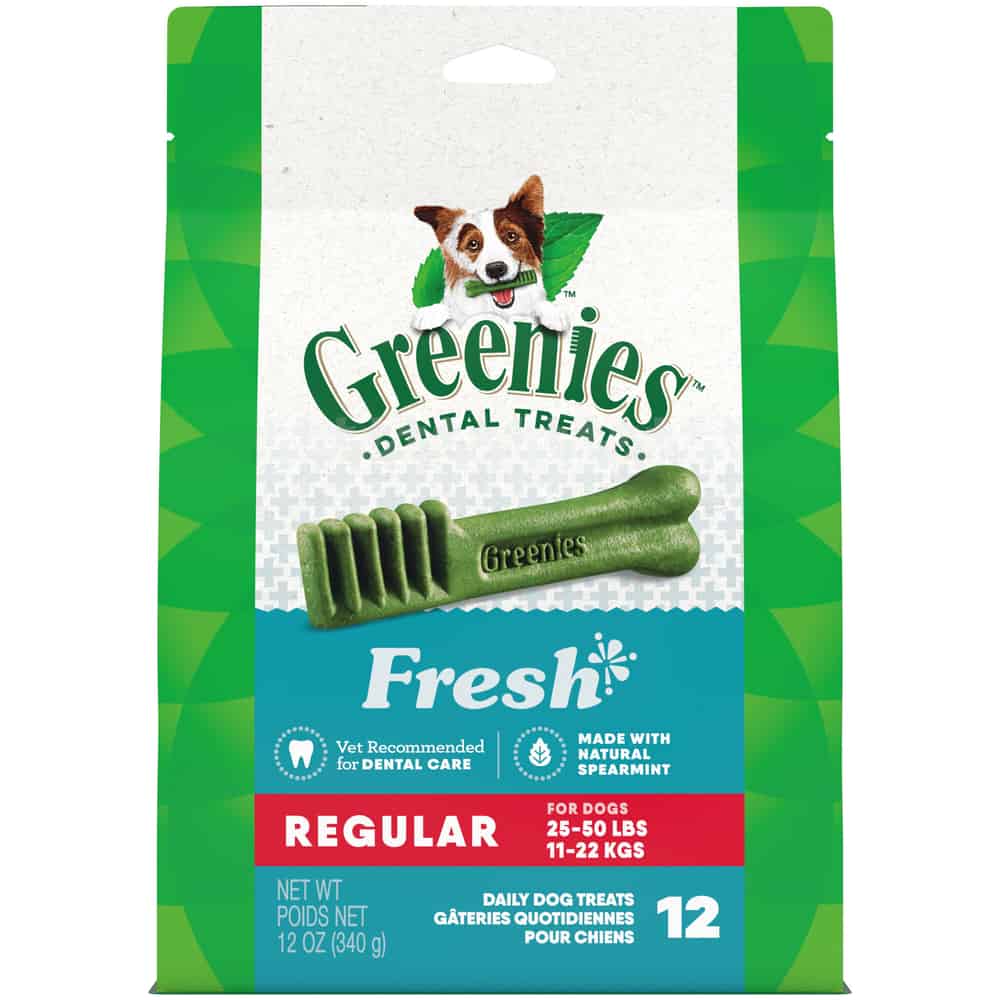 One Greenies Fresh Dental Treat is all it takes for clean teeth, fresh breath, and a happy dog. Your dog can't wait to sink their teeth into these delicious dental dog breath chews because they are bursting with breath-freshening mint flavor and feature a delightfully chewy texture that fights plaque and tartar.