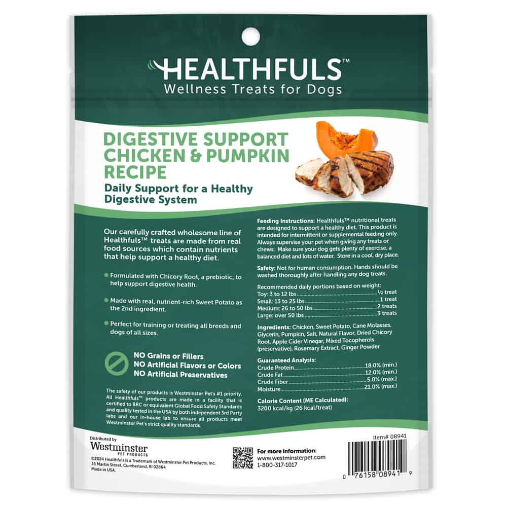 Treat your pup Healthfuls™ Digestive Support Soft Chew Dog Treats, with functional benefits, made in the USA from real food sources and formulated to support digestive health in dogs while treating them to the delicious tastes of chicken and pumpkin!