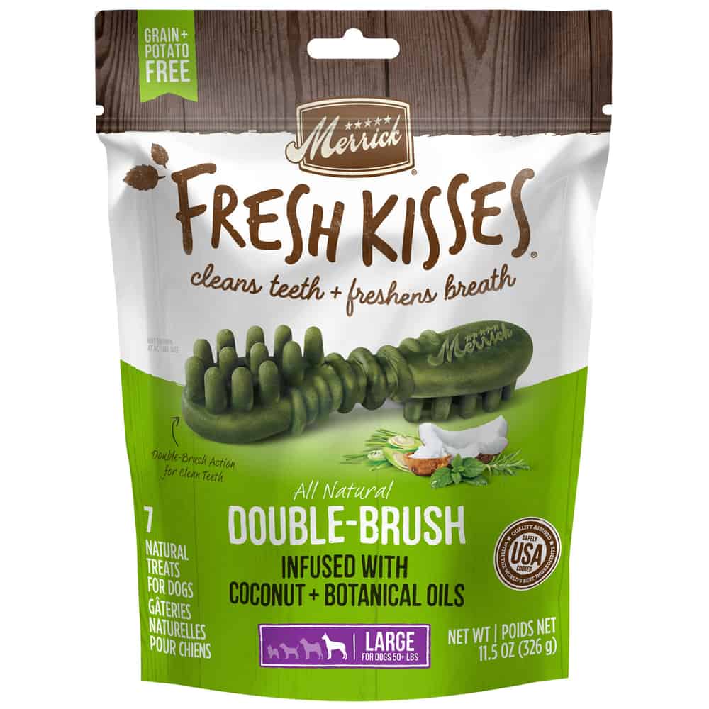 • Merrick dog treats that feature a unique double brush design are perfect for dog teeth cleaning and as a dog breath freshener like no other dog dental treats