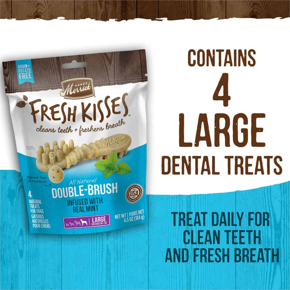- Merrick dog treats that feature a unique double brush design are perfect for dog teeth cleaning and as a dog breath freshener like no other dog dental treats