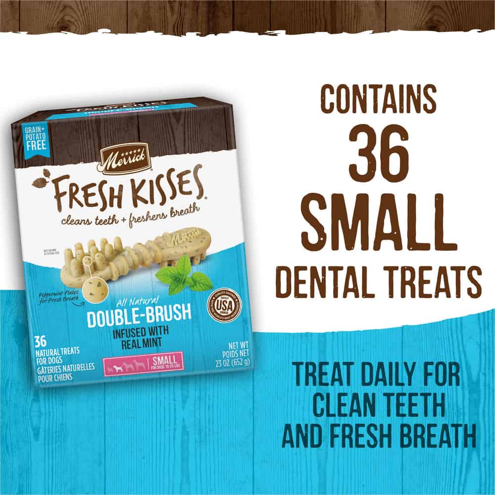 • Merrick dog treats that feature a unique double brush design are perfect for dog teeth cleaning and as a dog breath freshener like no other dog dental treats
