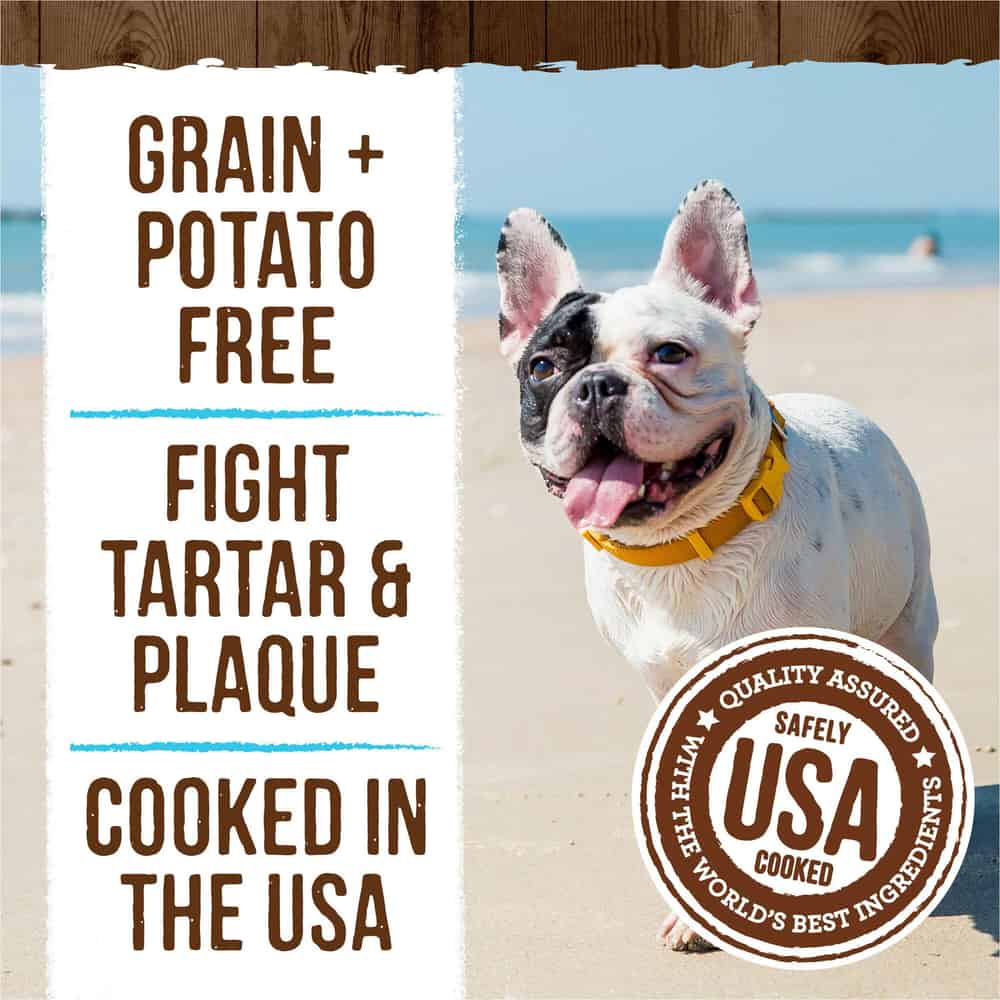 • Grain free dog treats are potato free. Cooked in the USA, these mint dog treats for small dogs weighing 5 to 15 pounds fight plaque and tarter