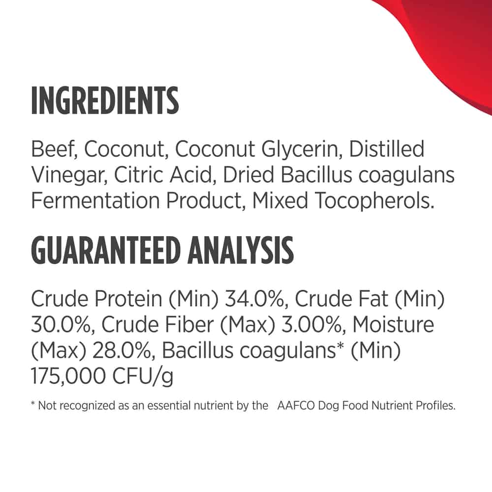 | Other Ingredients: Beef, Coconut, Coconut Glycerin, Distilled Vinegar, Citric Acid (as preservative), Dried Bacillus coagulans Fermentation Product, Mixed Tocopherols (as preservative). |