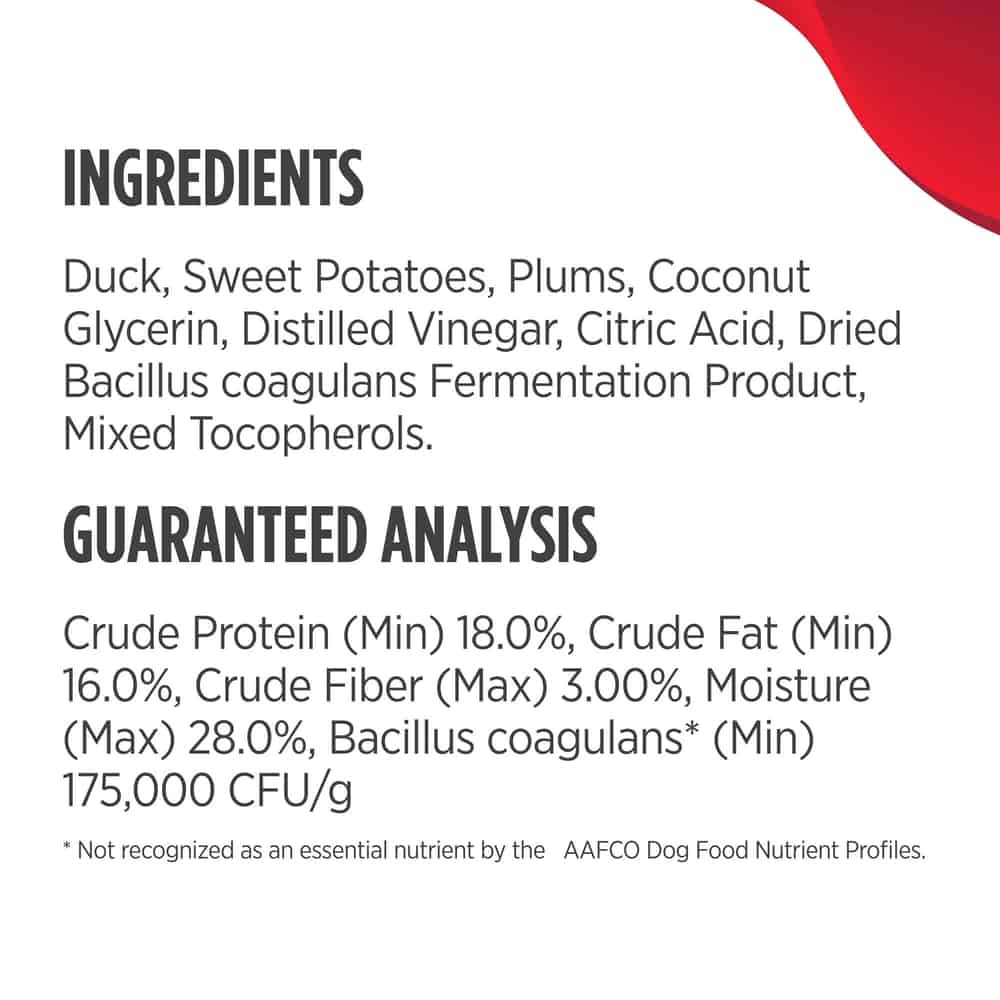 | Other Ingredients: Duck, Sweet Potatoes, Plums, Coconut Glycerin, Distilled Vinegar, Citric Acid (as preservative), Dried Bacillus coagulans Fermentation Product, Mixed Tocopherols (as preservative). |