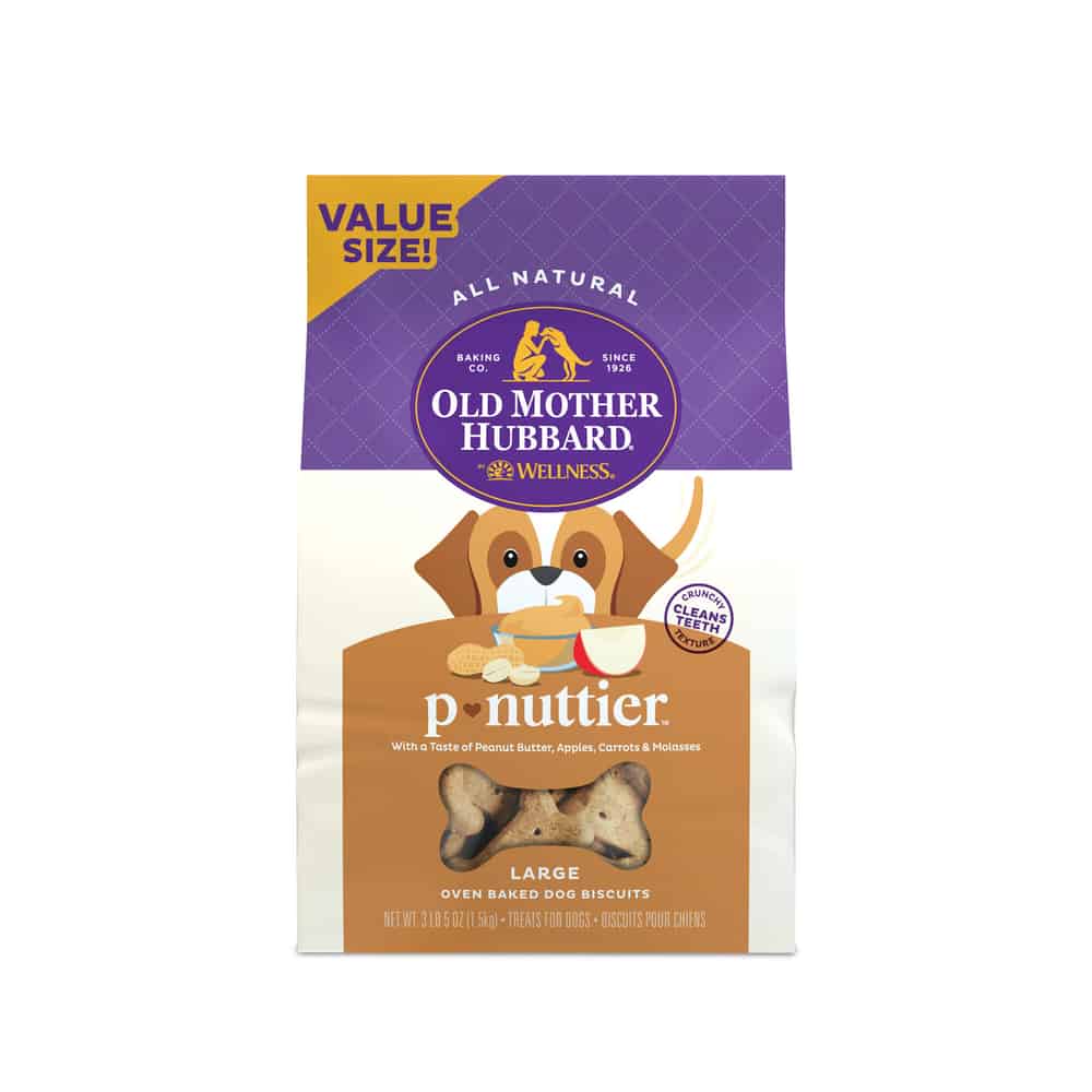 Old Mother Hubbard by Wellness, exists to nourish the life you share with your pets. They know every treating moment is a chance to show ‘em some love. That’s why their homestyle recipes start with all-natural, mouthwatering ingredients. Each biscuit is slowly oven-baked to preserve the natural flavors in varieties dogs love to catch, chew and eat. Classic great taste since 1926. These P-Nuttier crunchy biscuits are made with a taste of peanut butter, apples, carrots, and molasses for a tasty and wholesome treat they'll love getting and you'll love giving. Treat Them Well with Old Mother Hubbard by Wellness- Treats well made because moments matter.