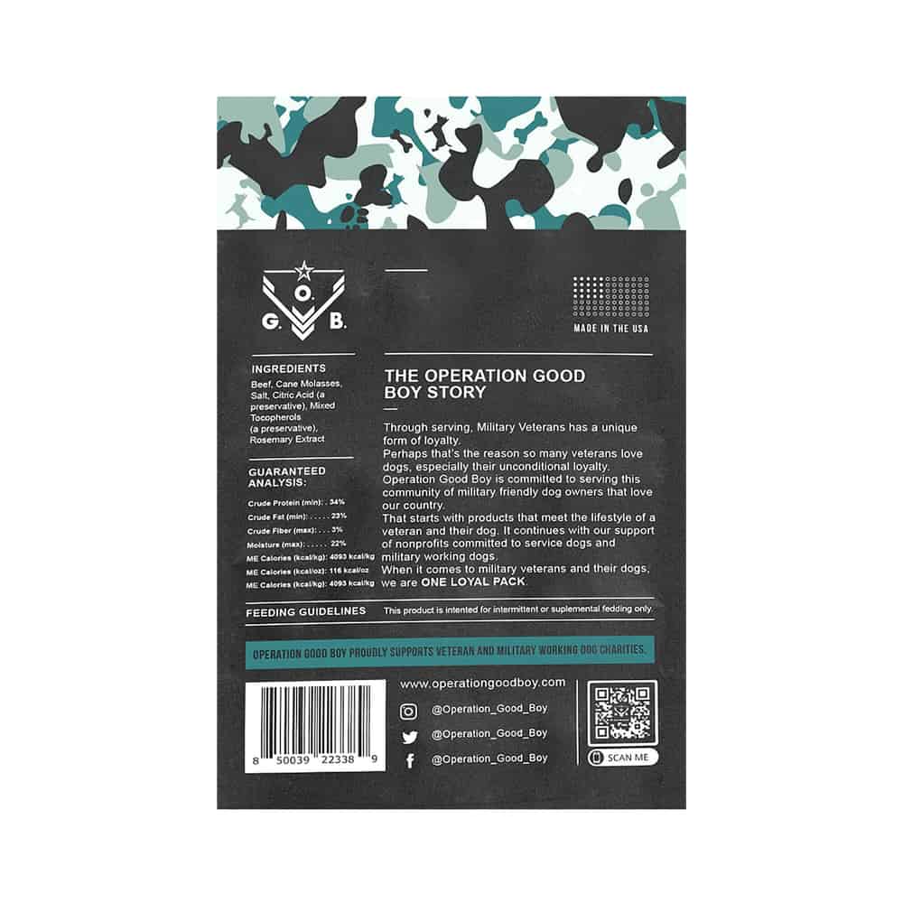 To veterans, the Stars and Stripes are more than just a pattern of red, white and blue cloth. It is an enduring symbol of the freedom and values we all cherish. Operation Good Boy’s “Stars & Strips” Jerky Strips give your dog meaty strips made with real meat and a chewy texture of genuine jerky. Stars & Strips Beef Jerky Strips. Made in the USA. Crafted to ensure your dog is getting a safe, quality jerky made from carefully selected ingredients. Convenient package to help preserve freshness. Veterinary-formulated. Makes training a breeze with easy, tasty positive reinforcement.