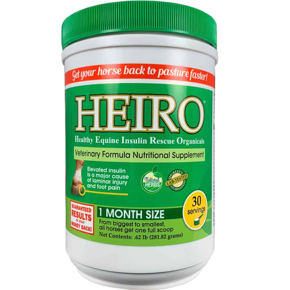 HEIRO Insulin Resistance is an herbal supplement that helps treat elevated insulin, a major cause of laminar injury and foot pain in horses. It helps stop foot pain caused by seasonal factors like grazing on new grass in the spring, summer heat, frost and ACTH surge in the fall, and cold stress in the winter.