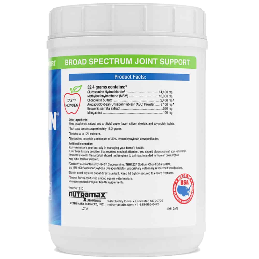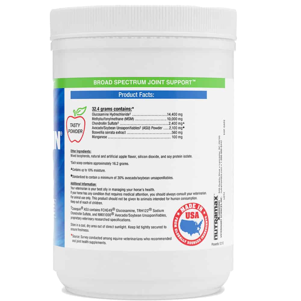 Cosequin ASU for Horses is a nutritional supplement that helps horses maintain healthy joints. It's rated the number one veterinarian-recommend brand. Cosequin ASU for Horses contains glucosamine, MSM (methylsulfonylmethane), and chondroitin, which can help improve joint and connective tissue health. It also contains ASU (avocado/soybean unsaponifiables) that help protect cartilage and support joint function.