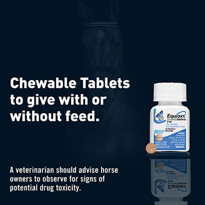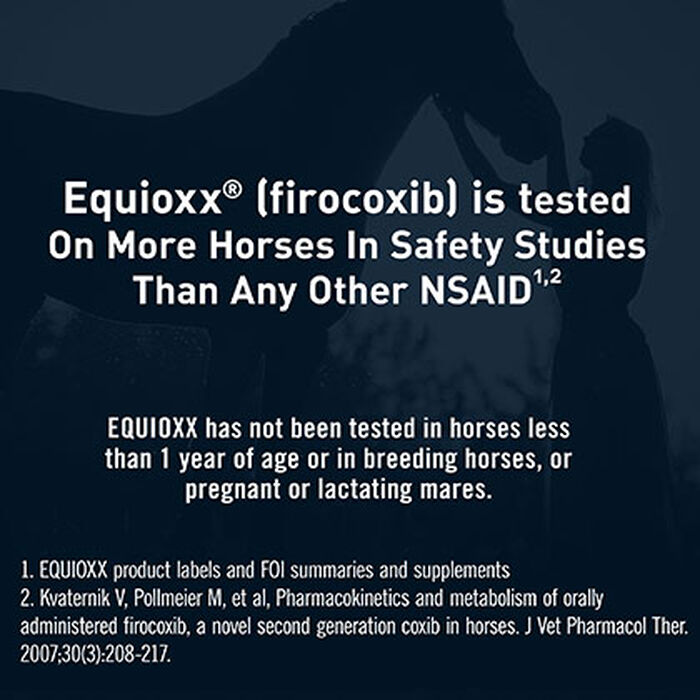Equioxx is an NSAID and requires a prescription from your veterinarian. It is used for the control of pain and inflammation due to osteoarthritis. The recommended dosage of Equioxx Tablets is one 57 mg tablet administered orally to horses weighing 800-1,300 lbs, once daily for up to 14 days. Treatment with Equioxx should not exceed 14 days. The recommended dosage of Equioxx Paste is 0.045 mg/lb of body weight once daily for up to 14 days. The safe use of Equioxx in horses less than 1 year in age, horses used for breeding, or in pregnant or lactating mares has not been evaluated.