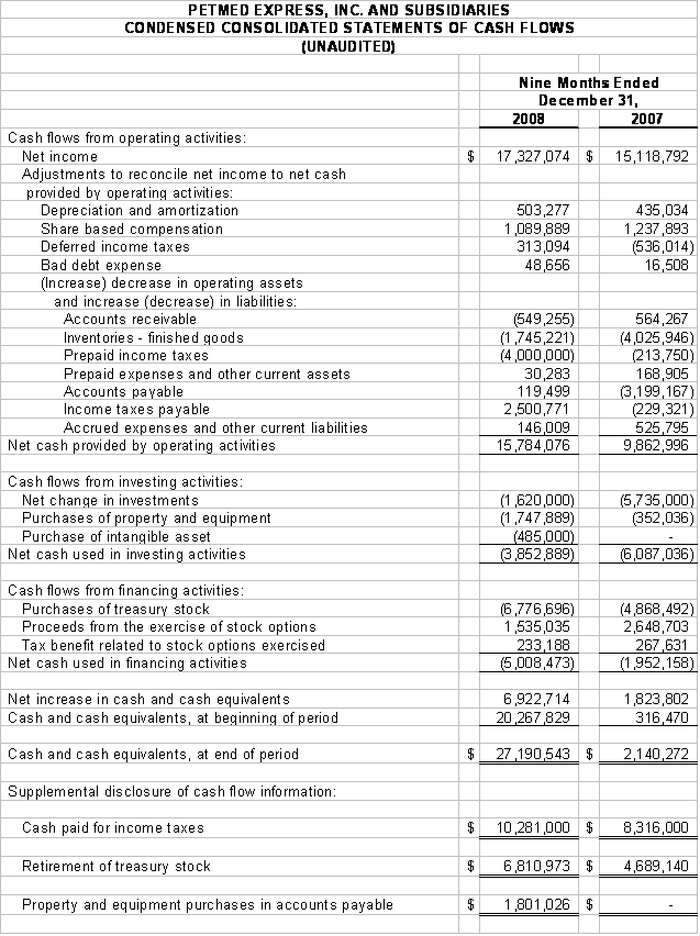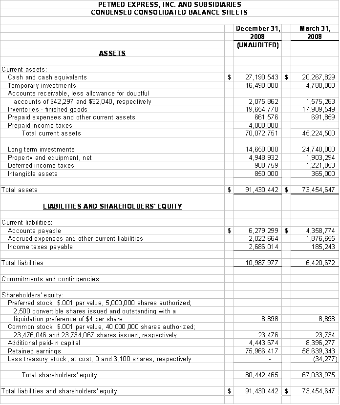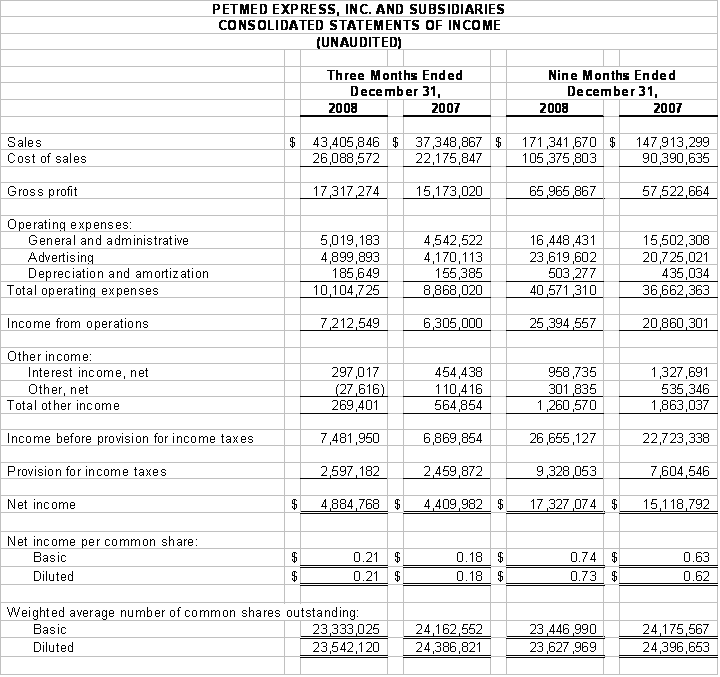 PETMED EXPRESS, INC. D/B/A 1-800-PETMEDS ANNOUNCES THIRD QUARTER FINANCIAL RESULTS New Order Sales Increase 25% Net Sales Increase 16% to $43.4 Million Earnings Increase 15% to $0.21 Diluted Per Share Pompano Beach, Florida, January 20, 2009 - PetMed Express, Inc. (NASDAQ: PETS) today announced its financial results for the quarter ended December 31, 2008. Net sales for this quarter were $43.4 million compared to $37.3 million for the quarter ended December 31, 2007, an increase of 16%. Net sales for the nine months ended December 31, 2008 were $171.3 million compared to $147.9 million for the nine months ended December 31, 2007, also an increase of 16%. Net income was $4.9 million or $0.21 diluted per share for the quarter ended December 31, 2008, compared to net income of $4.4 million or $0.18 diluted per share for the quarter ended December 31, 2007, an increase to earnings per share of 15%. For the nine months ended December 31, 2008, net income was $17.3 million or $0.73 diluted per share compared to net income of $15.1 million or $0.62 diluted per share for the nine months ended December 31, 2007, an increase to earnings per share of 18%. Menderes Akdag, President and CEO, commented: “We are pleased to report that new order sales increased by 25% to $11.2 million for the quarter ended December 31, 2008, compared to $9.0 million for the same quarter the prior year. We acquired approximately 154,000 new customers in the quarter ended December 31, 2008, compared to 127,000 new customers for the same quarter the prior year. We are also pleased to report that our net cash from operations increased by 60% to $15.8 million for the nine months ended December 31, 2008 from $9.9 million for the same period the prior year. Our continuing focus will be on capturing additional market share, and improving reorders and our customer service levels in fiscal 2009. Additionally, the Company repurchased approximately 336,000 shares of its outstanding common stock for approximately $4.6 million during the third quarter of fiscal 2009.” This morning at 8:30 A.M. Eastern Time, Mr. Akdag will host a conference call to review the quarter’s financial results. To access the call which is open to the public, dial (888) 455-1758 (toll free) or (210) 234-0009. Callers will be required to supply PETMEDS as the passcode. For those unable to participate in the live event, the call will be available for replay from 10 A.M. on January 20, 2009 until February 3, 2009 at 11:59 P.M. To access the replay, call (866) 507-3618 (toll free) or (203) 369-1892, and enter passcode 5500. Founded in 1996, PetMed Express is America’s Largest Pet Pharmacy, delivering prescription and non-prescription pet medications and other health products for dogs, cats, and horses at competitive prices direct to the consumer through its 1-800-PetMeds toll free number and on the Internet through its website at www.1800petmeds.com. This press release may contain “forward-looking” statements, as defined in the Private Securities Litigation Reform Act of 1995 or by the Securities and Exchange Commission, that involve a number of risks and uncertainties, including the Company’s ability to meet the objectives included in its business plan. Important factors that could cause results to differ materially from those indicated by such “forward-looking” statements are set forth in Management’s Discussion and Analysis of Financial Condition and Results of Operations in the PetMed Express Annual Report on Form 10-K for the year ended March 31, 2008. The Company’s future results may also be impacted by other risk factors listed from time to time in its SEC filings, including, but not limited to, the Company's Form 10-Q and its Annual Report on Form 10-K. For investment relations contact PetMed Express, Inc., Bruce S. Rosenbloom, CFO, 954-979-5995. ![]() ![]() ![]() |