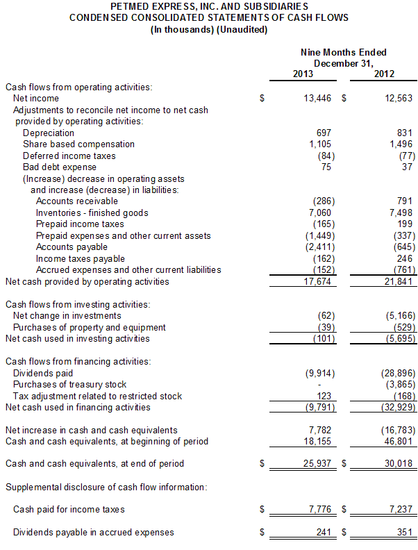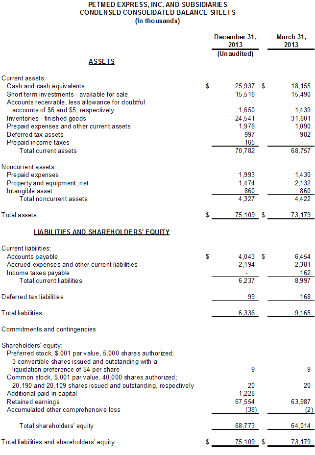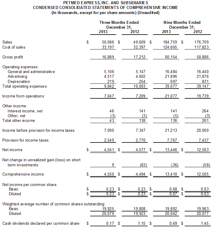 Pompano Beach, Florida, January 21, 2014 - PetMed Express, Inc. (NASDAQ: PETS) today announced its financial results for the quarter ended December 31, 2013. Net sales for the quarter ended December 31, 2013 were $50.1 million, compared to $49.6 million for the quarter ended December 31, 2012, an increase of 1.0%. Net sales for the nine months ended December 31, 2013 were $184.8 million, compared to $176.7 million for the nine months ended December 31, 2012, an increase of 4.6%. Net income was $4.5 million, or $0.23 diluted per share, for the quarter ended December 31, 2013, compared to net income of $4.6 million, or the same $0.23 diluted per share, for the quarter ended December 31, 2012. Net income was $13.4 million, or $0.67 diluted per share, for the nine months ended December 31, 2013, compared to net income of $12.6 million, or $0.63 diluted per share, for the nine months ended December 31, 2012, a 7.2% increase to EPS. Reorder sales increased by 3.6%, from $40.9 million to $42.4 million for the quarters ended December 31, 2012 and 2013, respectively. Additionally, the Company’s online sales increased by 2.1% to $39.5 million for the quarter ended December 31, 2013, compared to $38.7 million for the same quarter the prior year, with approximately 79% of all orders being generated from its website during the quarter compared to 78% for the same quarter the prior year.