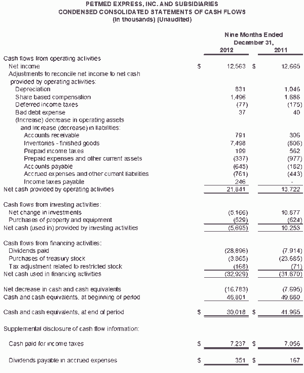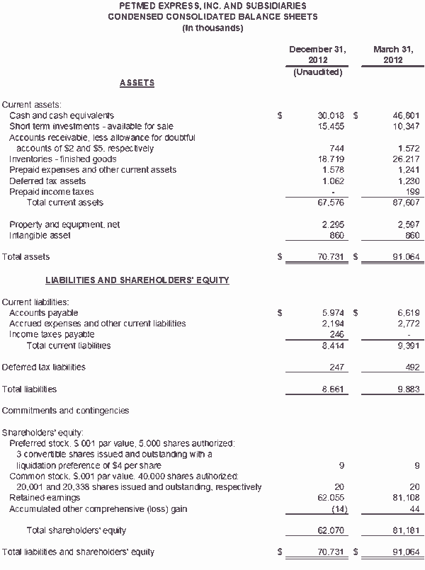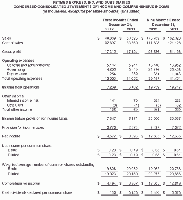 PETMED EXPRESS D/B/A 1-800-PETMEDS ANNOUNCES ITS FIRST QUARTER FINANCIAL RESULTSPompano Beach, Florida, January 22, 2013 - PetMed Express, Inc. (NASDAQ: PETS) today announced its financial results for the quarter ended December 31, 2012. Net income was $4.6 million, or $0.23 diluted per share, for the quarter ended December 31, 2012, compared to net income of $3.9 million, or $0.19 diluted per share, for the quarter ended December 31, 2011, a 19% increase to EPS. Net income was $12.6 million, or $0.63 diluted per share, for the nine months ended December 31, 2012, compared to net income of $12.7 million, or $0.61 diluted per share, for the nine months ended December 31, 2011, a 3.2% increase to EPS. Net sales for the quarter ended December 31, 2012 were $49.6 million, compared to $50.5 million for the quarter ended December 31, 2011, a decrease of 1.8%. Net sales for the nine months ended December 31, 2012 were $176.7 million, compared to $182.3 million for the nine months ended December 31, 2011, a decrease of 3.1%. Online sales increased slightly for the quarter ended December 31, 2012, with approximately 78% of all sales being generated via the Internet, compared to 77% for the same period the prior year. Menderes Akdag, President & CEO, commented: "We were able to increase our gross margins and decrease our operating expenses to improve our bottom line results this quarter. For the quarter ending December 31, 2012 our gross profit increased by 75 basis points, this increase can be attributed to a change in our product mix to higher margin items, including generics. For the quarter ending December 31, 2012 our operating expenses decreased by 170 basis points, mainly due to a reduction in advertising spending. The advertising costs of acquiring a new customer were reduced to $35 for the quarter ended December 31, 2012, compared to $36 for the same quarter the prior year. Cash from operation for the nine months ended December 31, 2012 increased 59% to $21.8 million, compared to $13.7 million for the same period the prior year. Although sales were slightly down during the quarter ended December 31, 2012, reorder sales increased by 1.2%. The unavailability of Novartis brands, due to the manufacturer’s suspended production, continued to negatively impact our sales. Looking to the future, we will continue to focus on advertising efficiency to improve new order sales and shift sales to higher margin items, including generics, while continuing to expand our product offerings." This morning at 8:30 A.M. Eastern Time, Mr. Akdag will host a conference call to review the quarter’s financial results. To access the call, which is open to the public, please dial (888) 455-1758 (toll free) or (203) 827-7025. Callers will be required to supply PETMEDS as the passcode. For those unable to participate in the live event, the call will be available for replay from 10:00 A.M. Eastern Time on January 22, 2013 until February 5, 2013 at 11:59 P.M. Eastern Time. To access the replay, call (800) 839-1163 (toll free) or (402) 998-1073, and enter passcode 5500. Founded in 1996, PetMed Express is America’s Largest Pet Pharmacy, delivering prescription and non-prescription pet medications and other health products for dogs and cats at competitive prices direct to the consumer through its 1-800-PetMeds toll free number and on the Internet through its website at www.1800petmeds.com. This press release may contain "forward-looking" statements, as defined in the Private Securities Litigation Reform Act of 1995 or by the Securities and Exchange Commission, that involve a number of risks and uncertainties, including the Company’s ability to meet the objectives included in its business plan. Important factors that could cause results to differ materially from those indicated by such "forward-looking" statements are set forth in Management’s Discussion and Analysis of Financial Condition and Results of Operations in the PetMed Express Annual Report on Form 10-K for the year ended March 31, 2012. The Company’s future results may also be impacted by other risk factors listed from time to time in its SEC filings, including, but not limited to, the Company's Form 10-Q and its Annual Report on Form 10-K. For investment relations contact PetMed Express, Inc., Bruce S. Rosenbloom, CFO, 954-979-5995. ![]() ![]() ![]() |
