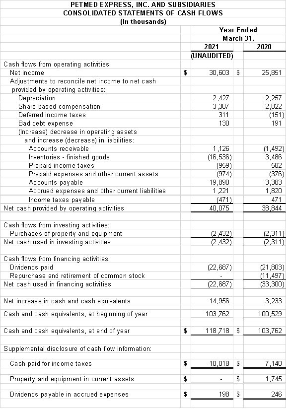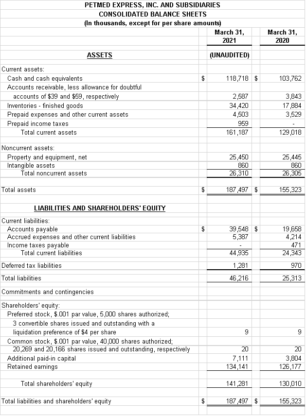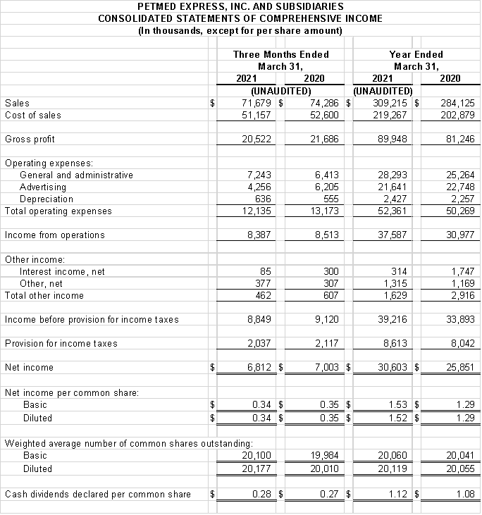 Delray Beach, Florida, May 3, 2021 - PetMed Express, Inc. (NASDAQ: PETS) today announced its financial results for its fourth quarter and fiscal year ended March 31, 2021. Net sales for the year ended March 31, 2021 were $309.2 million, compared to $284.1 million for the year ended March 31, 2020, an increase of 8.8%. Net income for the year ended March 31, 2021 was $30.6 million, or $1.52 diluted per share, compared to net income of $25.9 million, or $1.29 diluted per share, for the prior year, an increase to net income of 18.4%. Reorder sales for the year ended March 31, 2021 were $272.6 million, compared to $248.6 million for the year ended March 31, 2020, an increase of 9.7%. New order sales for the year ended March 31, 2021 were $36.6 million, compared to $35.6 million for the year ended March 31, 2020, an increase of 2.8%. The Company acquired approximately 443,000 new customers in the year ended March 31, 2021, compared to 421,000 new customers in the prior year. The average order size for the year ended March 31, 2021 was $89, compared to $87 for the year ended March 31, 2020. Net sales for the quarter ended March 31, 2021 were $71.7 million, compared to $74.3 million for the quarter ended March 31, 2020, a decrease of 3.5%. Net income for the quarter ended March 31, 2021 was $6.8 million, or $0.34 diluted per share, compared to net income of $7.0 million, or $0.35 diluted per share, for the same quarter the prior year, a decrease to net income of 2.7%. The average order size for the quarter ended March 31, 2021 was $93, compared to $90 for the quarter ended March 31, 2020.