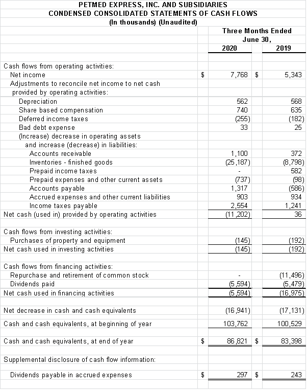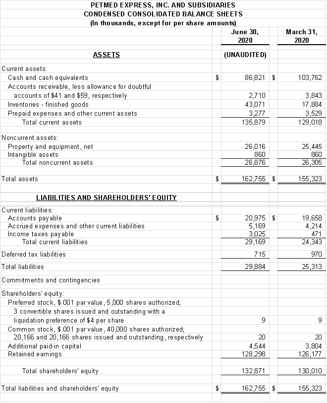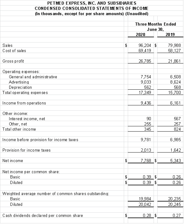 Delray Beach, Florida, July 20, 2020 - PetMed Express, Inc. (NASDAQ: PETS) today announced its financial results for its first quarter ended June 30, 2020. Net sales for the quarter ended June 30, 2020 were $96.2 million, compared to $80.0 million for the quarter ended June 30, 2019, an increase of 20%. Net income for the quarter ended June 30, 2020 was $7.8 million, or $0.39 diluted per share, compared to net income of $5.3 million, or $0.26 diluted per share, for the same quarter the prior year, an increase to diluted earnings per share of 47%. Reorder sales for the three months ended June 30, 2020 were $80.4 million, compared to $67.7 million for the three months ended June 30, 2019, an increase of 19%. New order sales for the three months ended June 30, 2020 were $15.8 million, compared to $12.2 million for the three months ended June 30, 2019, an increase of 29%. The Company acquired approximately 186,000 new customers in the quarter ended June 30, 2020, compared to 140,000 new customers in the same period the prior year. The average order size for the quarter ended June 30, 2020 was $89, compared to $86 for the quarter ended June 30, 2019.