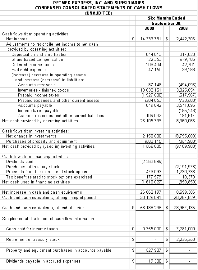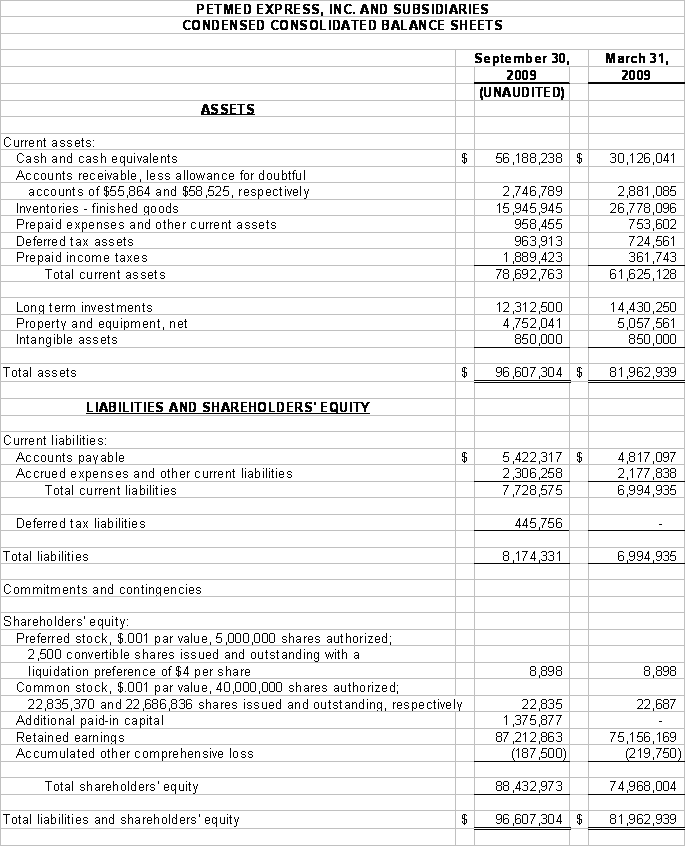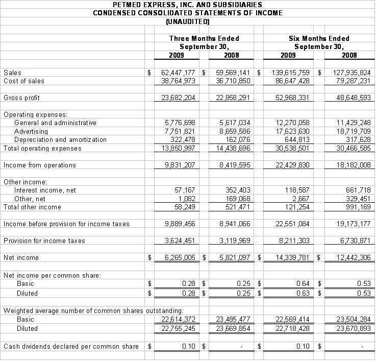 Earnings Increase 12% to $0.28 EPS Reorder Sales Increase 11% to $45.8 MillionPompano Beach, Florida, October 19, 2009 - PetMed Express, Inc. (NASDAQ: PETS) today announced its financial results for the quarter ended September 30, 2009. Net income was $6.3 million, or $0.28 diluted per share, for the quarter ended September 30, 2009, compared to net income of $5.8 million, or $0.25 diluted per share, for the quarter ended September 30, 2008, a 12% increase to EPS. For the six months ended September 30, 2009, net income was $14.3 million or $0.63 diluted per share compared to net income of $12.4 million or $0.53 diluted per share for the six months ended September 30, 2008, an increase to earnings per share of 20%. Net sales for the quarter ended September 30, 2009 were $62.4 million, compared to $59.6 million for the quarter ended September 30, 2008, an increase of 5%. Net sales for the six months ended September 30, 2009 were $139.6 million, compared to $127.9 million for the six months ended September 30, 2008, an increase of 9%. Reorder sales increased by 11%, from $41.4 million to $45.8 million for the quarters ended September 30, 2008 and 2009, respectively. Reorder sales for the six months ended September 30, 2009 were $99.8 million, compared to $87.6 million for the six months ended September 30, 2008, an increase of 14%.