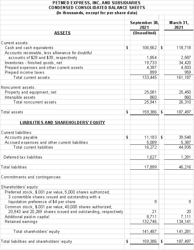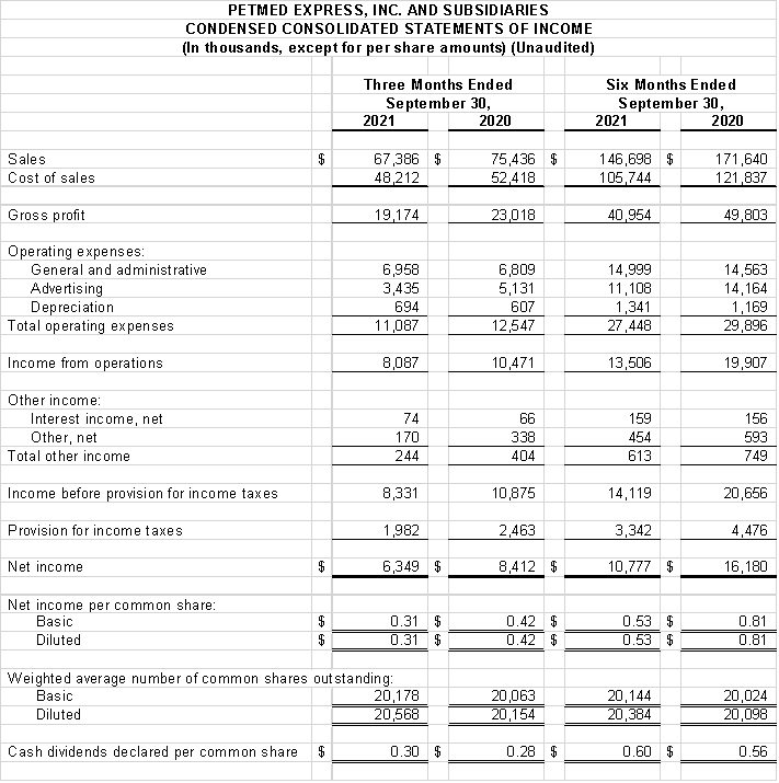 Delray Beach, Florida, October 25, 2021, PetMed Express, Inc. (NASDAQ: PETS) today announced its financial results for the quarter ended September 30, 2021. Net sales for the quarter ended September 30, 2021 were $67.4 million, compared to $75.4 million for the quarter ended September 30, 2020, a decrease of 10.7%. Net sales for the six months ended September 30, 2021 were $146.7 million, compared to $171.6 million for the six months ended September 30, 2020, a decrease of 14.5%. Net income was $6.3 million, or $0.31 diluted per share, for the quarter ended September 30, 2021, compared to net income of $8.4 million, or $0.42 diluted per share, for the quarter ended September 30, 2020, a 24.5% decrease to net income. Net income was $10.8 million, or $0.53 diluted per share, for the six months ended September 30, 2021, compared to net income of $16.2 million, or $0.81 diluted per share, for the six months ended September 30, 2020, a 33.4% decrease to net income. Average order size increased from $87 to $92 for the quarters ended September 30, 2020 and 2021, respectively.