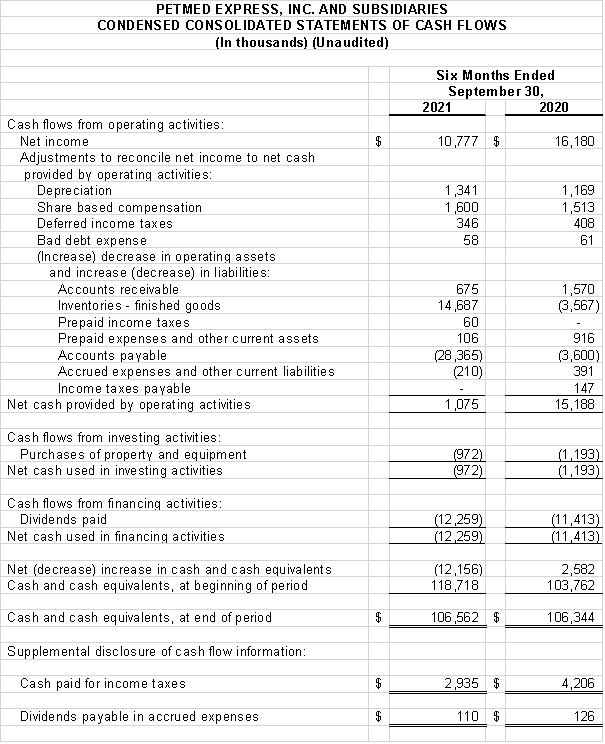 This press release may contain "forward-looking" statements, as defined in the Private Securities Litigation Reform Act of 1995 or by the Securities and Exchange Commission, that involve a number of risks and uncertainties, including the Company's ability to meet the objectives included in its business plan. Important factors that could cause results to differ materially from those indicated by such "forward-looking" statements are set forth in Management's Discussion and Analysis of Financial Condition and Results of Operations in the PetMed Express Annual Report on Form 10-K for the year ended March 31, 2021. The Company's future results may also be impacted by other risk factors listed from time to time in its SEC filings, including, but not limited to, the Company's Form 10-Q and its Annual Report on Form 10-K. For investment relations contact PetMed Express, Inc., Bruce S. Rosenbloom, CFO, 561-526-4444.